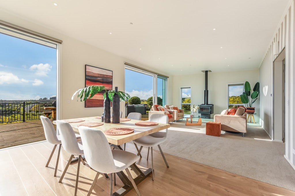 Designed for effortless indoor-outdoor living, two sets of sliding stacker doors open onto a generous timber deck - an inviting space to relax and take in the scenery. A Masport wood burner, underfloor heating, and double glazing provide warmth and comfort in cooler months, while electric blinds and a sprinkler system offer convenience and security.
