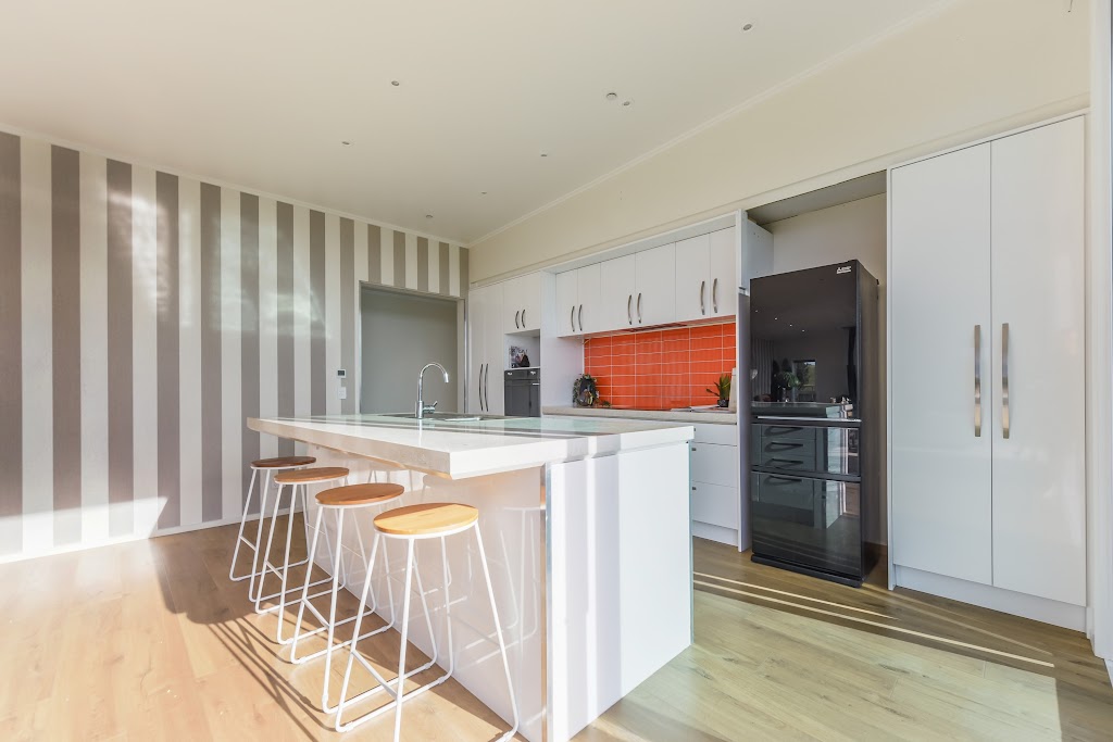 The vibrant orange door leads into an open-plan living area flooded with natural light and framed by picturesque views. The modern kitchen features a handcrafted concrete benchtop with unique wine bottle inlays and premium Miele appliances.